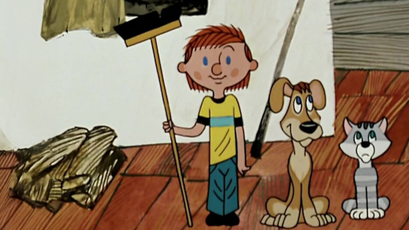 Начало истории дяди Федора, кота Матроскина и пса Шарика. За кадром – неподражаемые Олег Табаков и Лев Дуров
